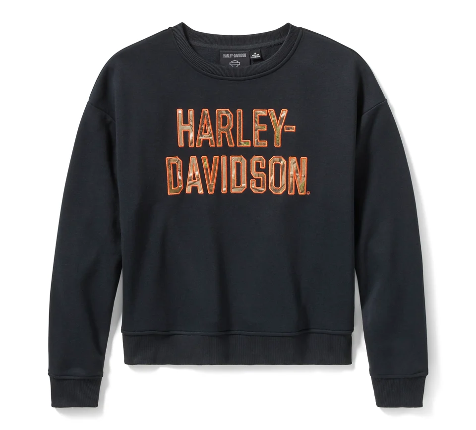 Migliora il tuo look da amante dell’outdoor con la felpa in pile H-D® Realtree® APG. La felpa è realizzata in pile misto cotone/poliestere per mantenerti al caldo quando le temperature scendono. Questo capo femminile presenta spalle scese e orli in costina per non sformarsi. Il dorso non è decorato in modo da concentrare l’attenzione sull’applicazione cucita sul davanti. Questa splendida immagine mostra le grafiche Harley-Davidson in uni schema Realtree APG, che mescola i colori delle foreste, delle praterie e dei fiumi ad altri ambienti esterni. Il capo fa parte dell’assortimento H-D Realtree APG, una linea in edizione speciale che unisce un classico motivo mimetico con un’altrettanto classica cultura motociclistica.