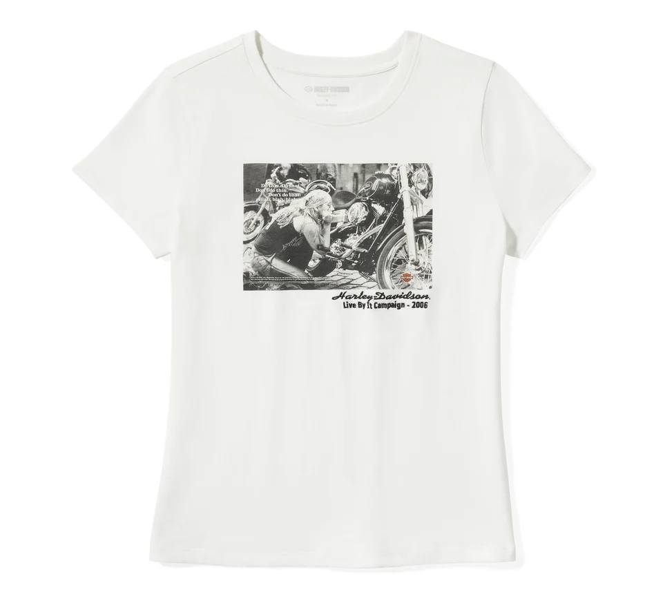 La libertà che ami dello stile di vita motociclistico viene catturata appieno nella maglietta Archive Photo. La maglietta è realizzata in jersey di cotone morbido per garantire un comfort totale, ed è provvista di girocollo in costina che conserva la forma. Ciò che distingue realmente questa t-shirt femminile è la pubblicità della campagna 2006 che campeggia sul davanti.