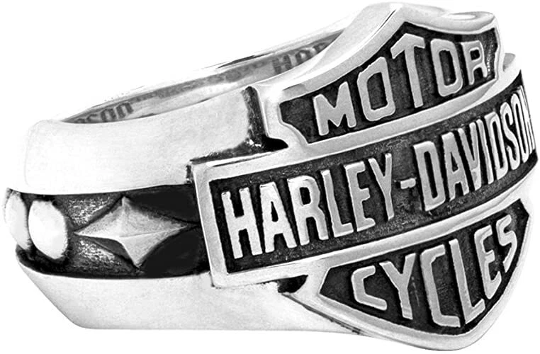 Questo anello da uomo Harley-Davidson® Bar and Shield, realizzato a mano in argento sterling, è impreziosito da dettagli neri per un look AUDACE. La fascia presenta un design decorativo semplice ma maschile lungo la parte posteriore del gambo. La fascia interna è incisa al laser con la scritta “Harley-Davidson®” nello stesso stile audace.
