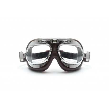 Occhiali Moto Maschera vintage anni ’60 in pelle marone e profilo in acciaio by Bertoni Italy AF191CRB maschera vintage per moto rivestita in pelle – frontale in acciaio cromato lenti antiurto in policarbonato 2,4mm di spessore lente con trattamento antifog 100% UV PROTECTION elastico regolabile ricoperto in seta ed adattabile al casco Fori di aerazione applicati nella parte superiore ed inferiore del frontale