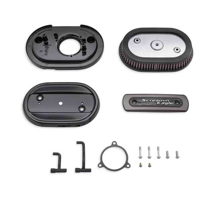 • Include coperchio del filtro dell’aria a basso profilo, elemento filtrante ad alto flusso, piastra posteriore in alluminio pressofuso, medaglione Screamin’ Eagle ® con taglio a diamante , calza antipioggia protettiva e tutto l’hardware di installazione necessario