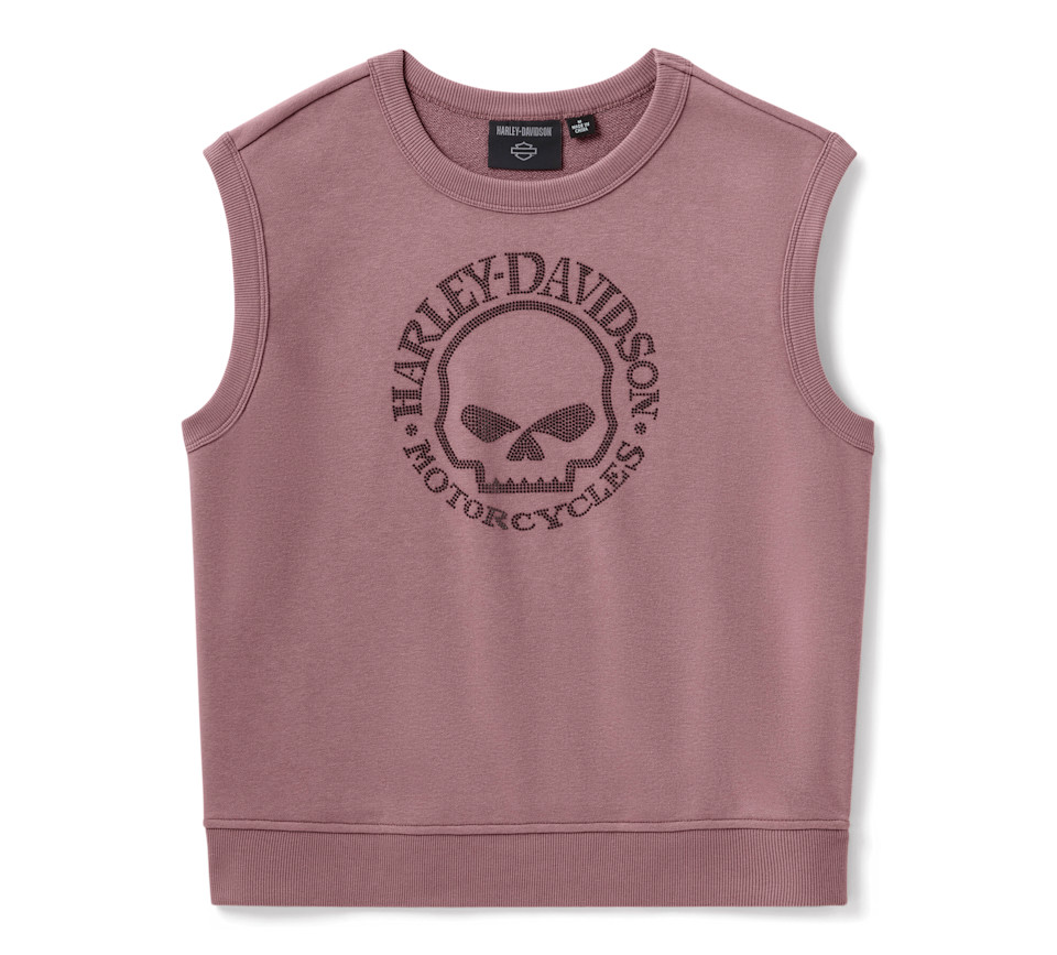 Togli le maniche, spazio alla brillantezza. Realizzata in French terry di cotone/poliestere, la nostra felpa girocollo senza maniche Willie G™ Skull Bling offre una vestibilità comoda e un’elegante variante della tradizionale felpa girocollo da donna. Presenta finiture in maglia a costine che preservano la forma ed è rifinita con un motivo Willie G Skull con strass applicato sul davanti. Sebbene l’iconica Skull sia una delle sue creazioni più popolari, Willie G. Davidson progettò anche diverse motociclette, tra cui il modello FX Super Glide® del 1971 e il modello FXS Low Rider® del 1977.