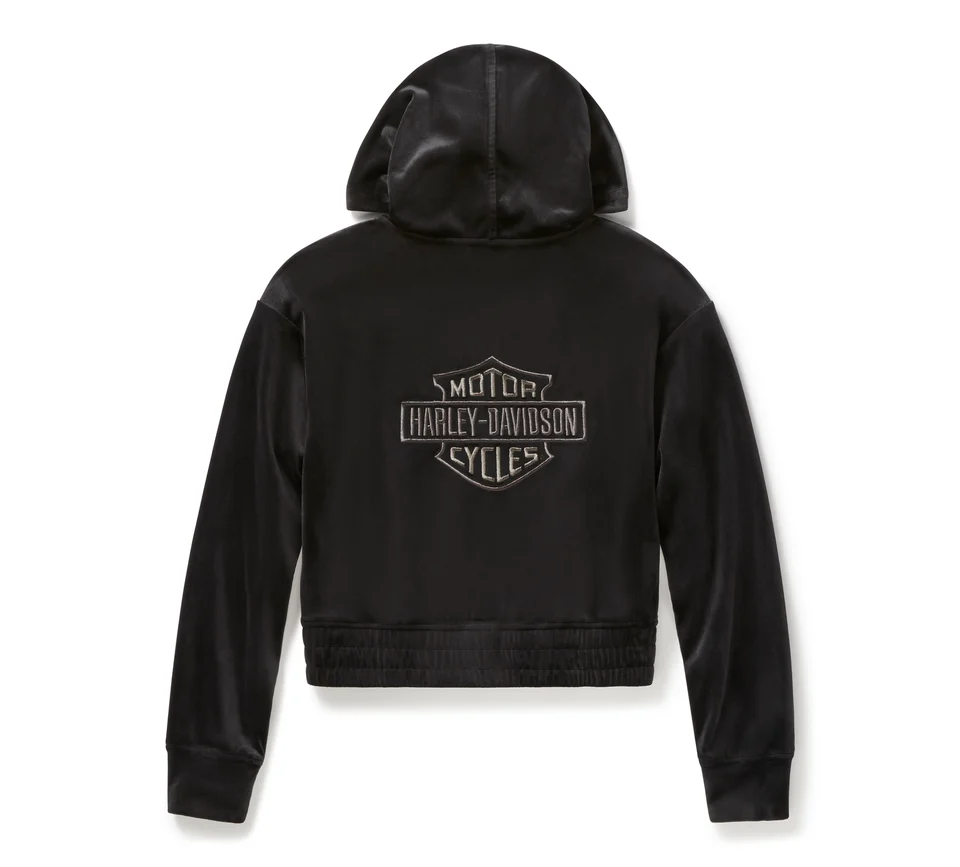 Tutta la comodità del velluto in questa splendida felpa con cappuccio. Perfetta per le giornate più frenetiche o le notti più tranquille, è realizzata in velluto di poliestere con un pizzico di elastan per maggiore elasticità. Questa felpa con cappuccio da donna presenta un orlo elastico arricciato valorizzante, oltre a un cappuccio non decorato munito di coulisse piatta e punte metalliche per esaltarne lo stile. Le grafiche sul davanti e sul dorso sono realizzate a ricamo in un lucente tono su tono.