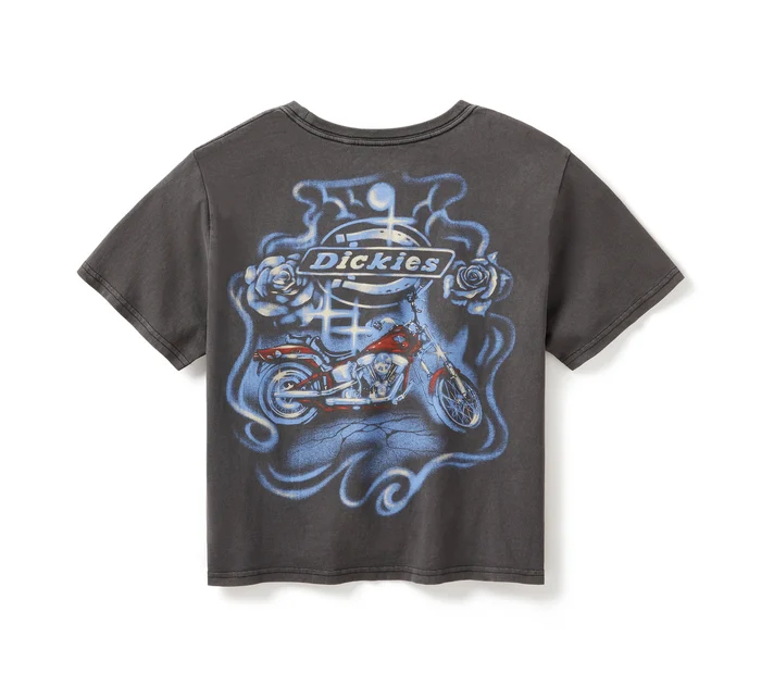 La maglietta è rifinita con un’esclusiva grafica retrò che raffigura la motocicletta Harley Softail del 1984. Il capo fa parte della collaborazione tra Dickies e H-D.