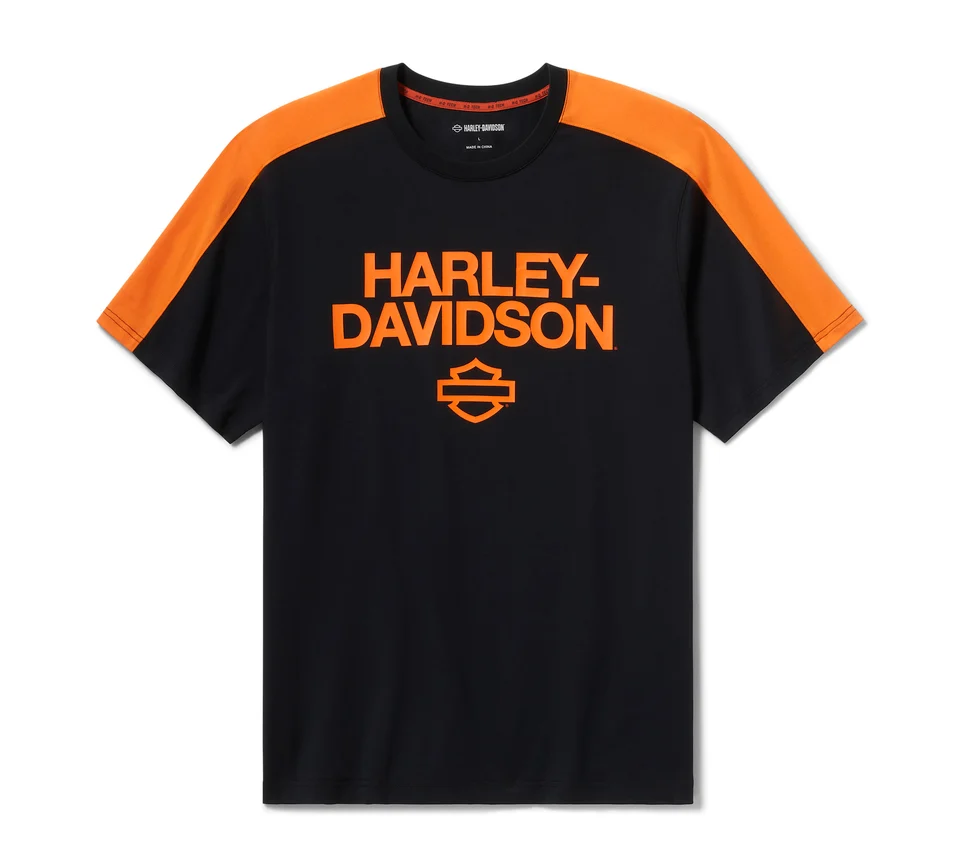 Lo stile vivace e fresco caratterizza la maglietta H-D® TECH Coolmax®. Il capo è realizzato in jersey misto Coolmax® che assorbe l’umidità e aiuta a tenere sotto controllo il sudore. Caratterizzata da una vestibilità comoda, la maglietta è munita di collo a costine che non si deforma. La vivacità cromatica è esaltata dalla composizione a contrasto sulle maniche e dalle grafiche in stile contemporaneo.
