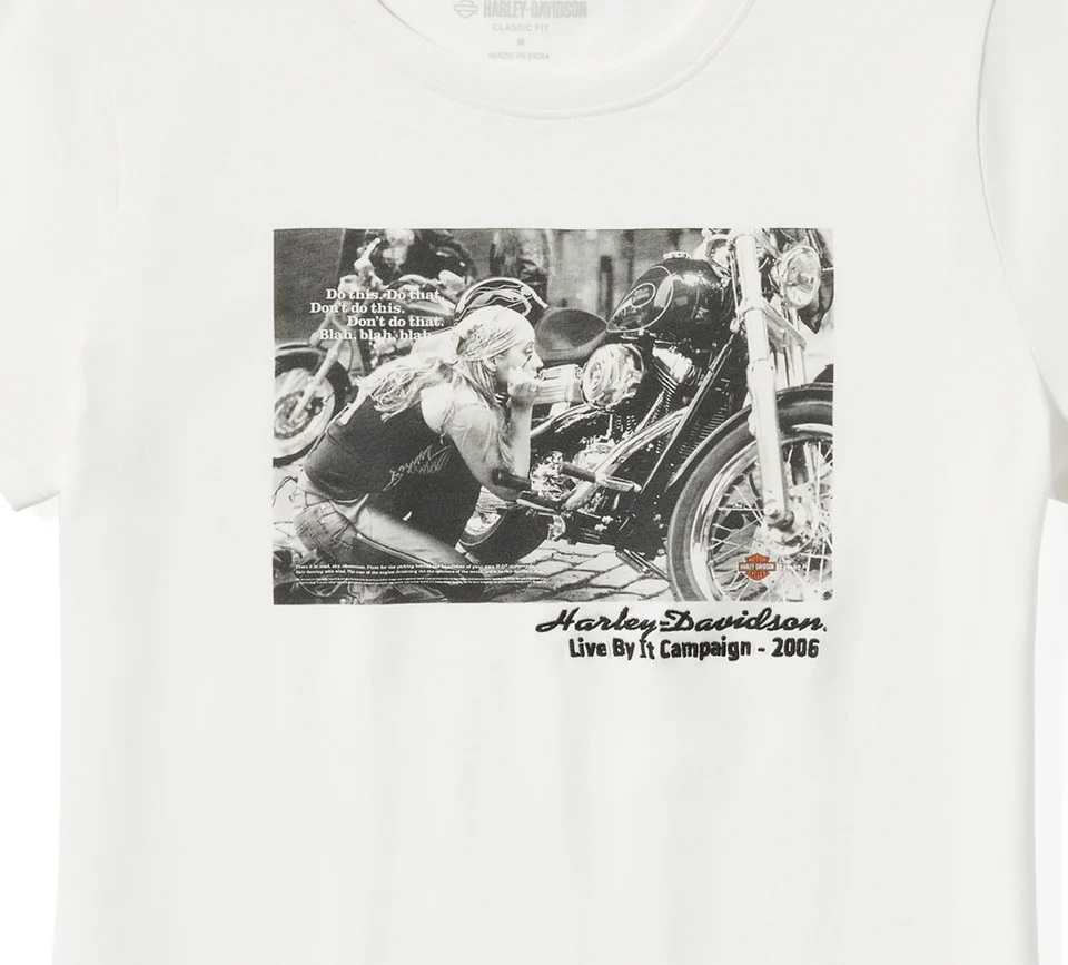 La libertà che ami dello stile di vita motociclistico viene catturata appieno nella maglietta Archive Photo. La maglietta è realizzata in jersey di cotone morbido per garantire un comfort totale, ed è provvista di girocollo in costina che conserva la forma. Ciò che distingue realmente questa t-shirt femminile è la pubblicità della campagna 2006 che campeggia sul davanti.