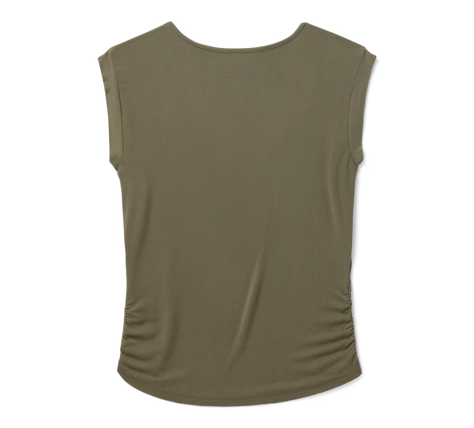 Ampia scollatura dentellata. Fasce da braccio integrate. Ruches sulla cucitura laterale. Orlo con risvolto.
