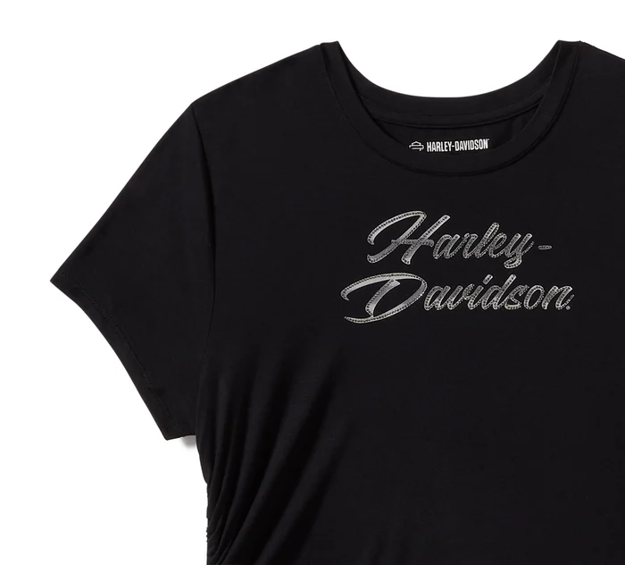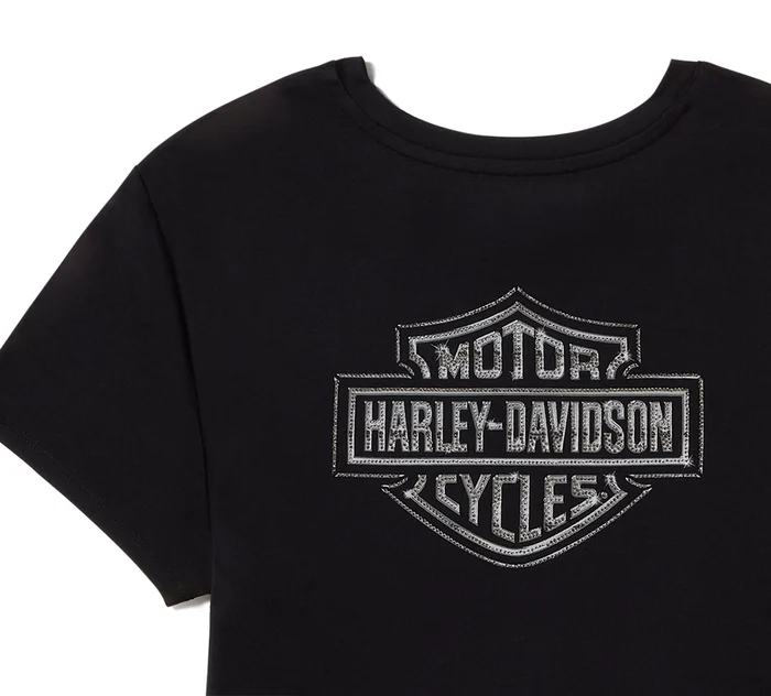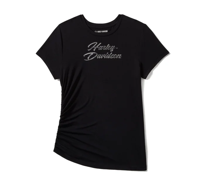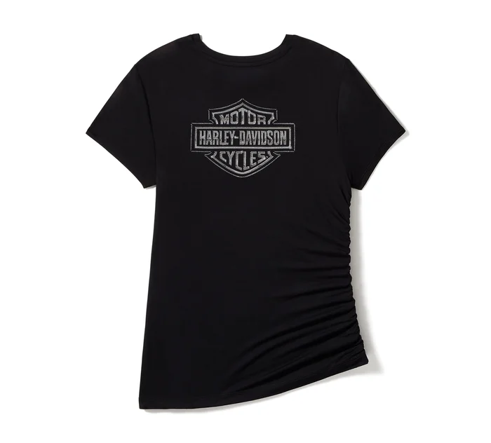 Aggiungi un po’ di brillantezza alla tua mise motociclistica indossando il top a maniche corte con ruches Essential Bling. Pensato per offrire la massima comodità, è realizzato in jersey di rayon ultra-morbido con un pizzico di spandex per aumentare l’elasticità. Questo top da donna è dotato di particolari che valorizzano le forme, come lo scollo rotondo e l’orlo asimmetrico con ruches sugli orli. Il capo è splendidamente rifinito con una grafica H-D su entrambi i lati per un look glam e senza tempo.